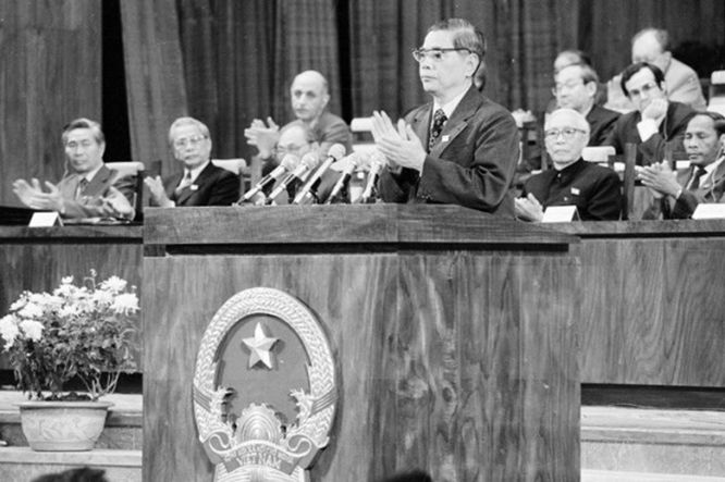 Đồng chí Nguyễn Văn Linh tại Đại hội Đảng lần thứ VI (Ảnh: Bảo Nhân dân)